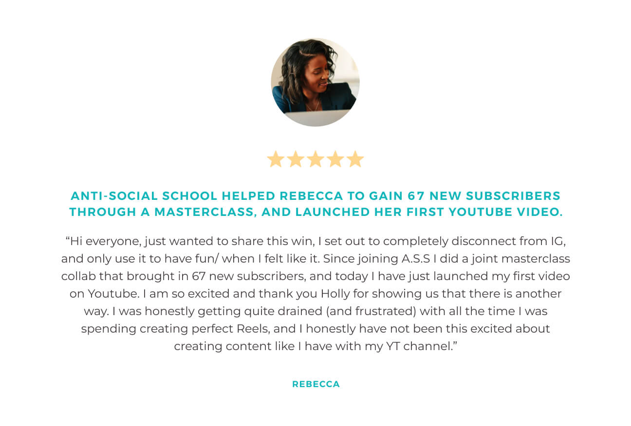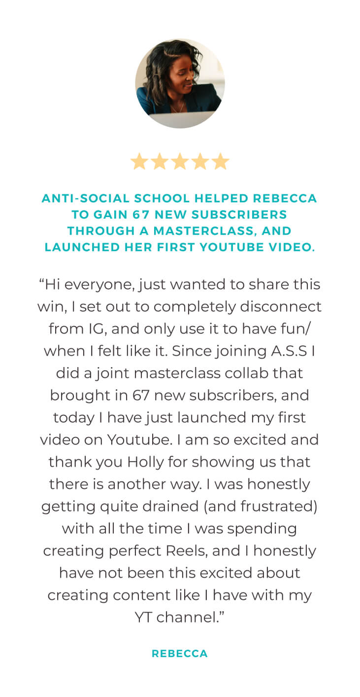 "But I don’t even have a team yet to help with my visibility! However, because of Anti-Social School™, I can still show up and *seem* like I’m everywhere – AND honor my other life commitments the way I envisioned.”