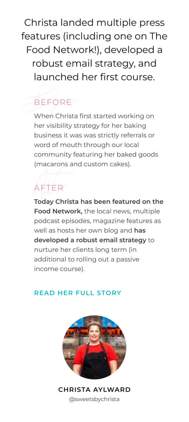 I’ve helped hundreds of women entrepreneurs scale their businesses with marketing and visibility strategies like this —and I’m here to help you do it too.