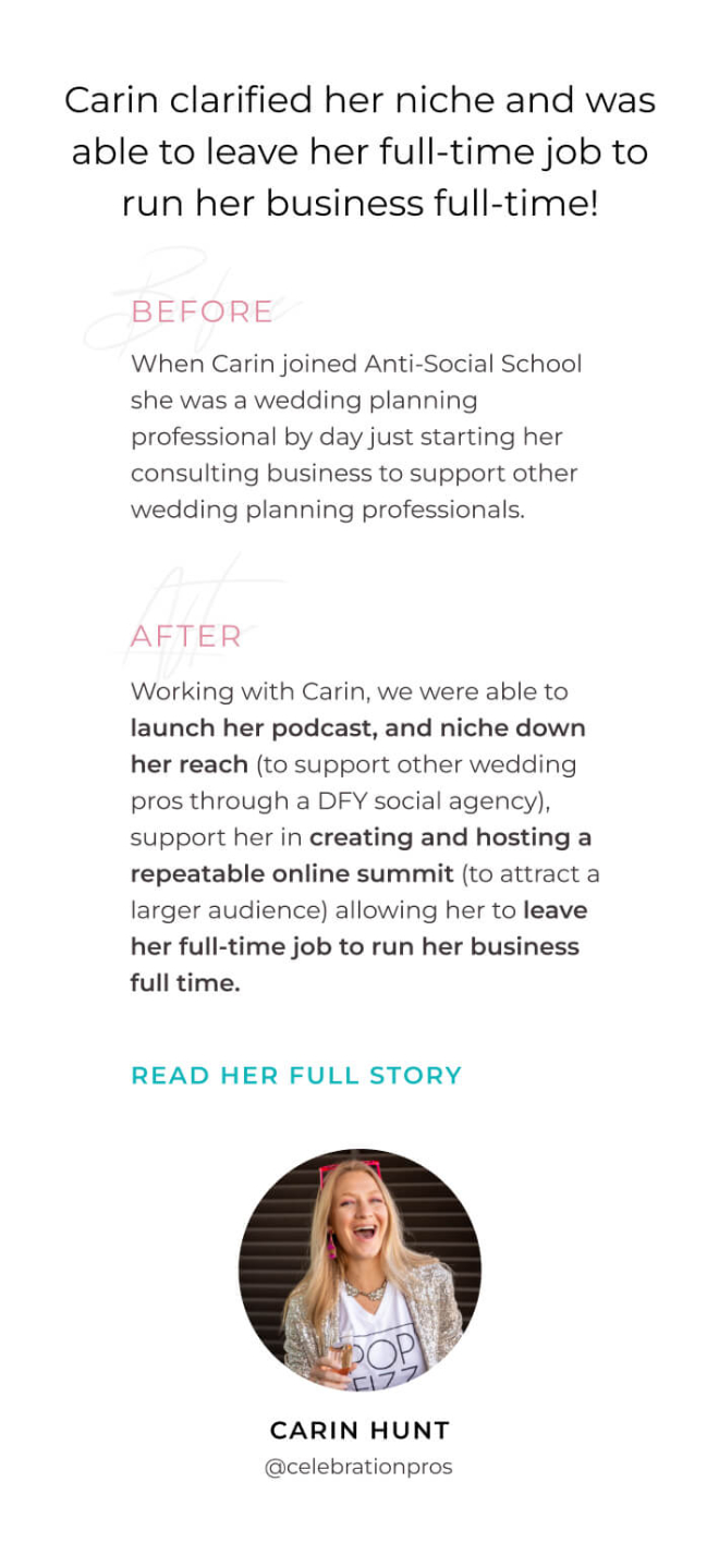 “Because of the strategy, connections, and collaborations I made in Anti-Social School™, I booked two 1:1 clients within a few weeks of completing this program!”